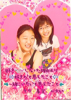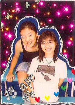 | lalalaas~ Saturday, April 15, 2006, 7:46 PM       yeah i think you all noe wad i did today. LOL. bck on the laptop again. since bro isnt hoggin it, he's slping.. and the damn full stop button isnt workin vehhh well. damn it. blahs. and the l button is missing, so i hab to lik press hard on the damn thingy. but wadever. anywayy..... mum cut my hair today. aft.. breakfast at central. bought a new handphone casing again. ITS TRANSPARENT! YAY.. and i think my bloggin style changed.. maybe jus for this post. no idea why. oh well. to cont.. she took lik 1 hr+ to cut it. =.= den weiting wanted me to go out.. den was askin my mum. she say cann, aft she cut finish my hair AND shower. so, weiting wanted to me to reach at toa payoh at 145. my mum FINISHED cuttin my hair at 145. dots. so called her blah blah. showered. changed and rched ther almost at 3. hah. so set off for orchard. went to kino firs. i bought my er mo xie zhen shu! w00t. den went to heeren. withdrew money and crapped alot. smtg abt lesbians. *wink* hahahaaaa. ONLY a certain few ppl noe.. lalalaas` bought new socks for myself. 2 pairs. COMFY. from mini toons. beige and pink. haha. thers paddin on the bottom. niceee~ aft that, took the neoprints. den went bck to taka and bought takopachi and bubble tea. yumm. was deciding between bubble tea and ice cream. chose bubble tea in the end. kinda regretted. lols. oh well. nvm. shall drag weiting AND darren to orchard nxt tym for .. smtg. LOL. only weiting noes. muahahahha. x) den aft that, went hme. so yeah, scanned the neoprints in and blogged. =) | |||